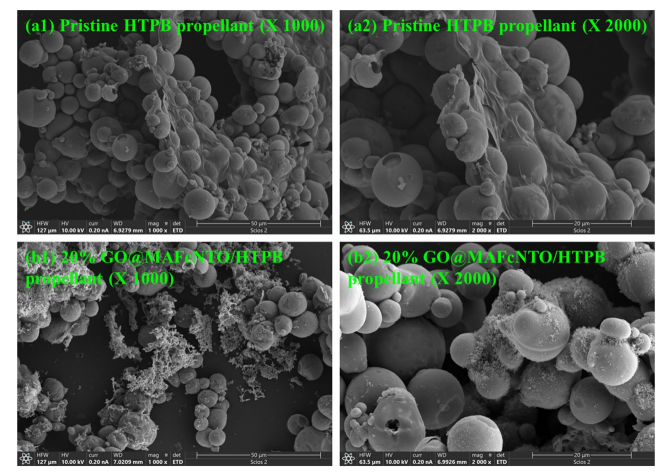 圖11. 含和不含推進(jìn)劑時20%GO@MAFcNTO在0.1 MPa下冷凝燃燒產(chǎn)物的SEM圖像。