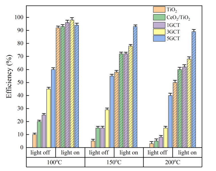 0在100-200℃時的氧化過程包括光催化和熱催化兩種反應機制。此外,rGO修飾的CeO