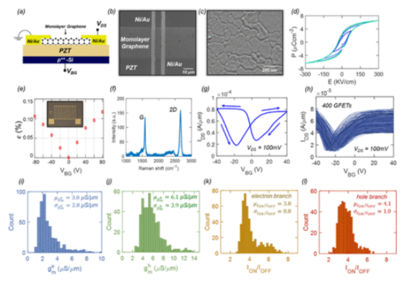 6V/m的矯頑場(chǎng)。(e) 通過(guò)測(cè)量Ni應(yīng)變儀上的電阻變化提取的PZT薄膜上作為偏壓函數(shù)的應(yīng)變(插圖)。(f) 使用532nm激光器獲得的石墨烯通道的拉曼光譜。1600和2700 cm