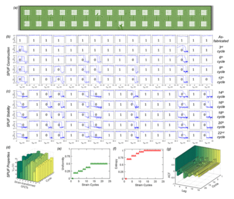 圖3.構(gòu)造一個(gè)應(yīng)變電子物理不可克隆函數(shù)(SPUF)。(a) 由16個(gè)GFET組成的代表性SPUF的光學(xué)圖像。(b) 通過(guò)應(yīng)變循環(huán)構(gòu)建SPUF的過(guò)程以及(c)隨后的SPUF穩(wěn)定性。(d) 應(yīng)變轉(zhuǎn)換的GFET的開(kāi)關(guān)閾值(VST)的分布,即裂紋打開(kāi)/閉合的VBG。SPUF構(gòu)建和穩(wěn)定性測(cè)試期間(e)均勻性(p)和(f)熵(e)的演變。正如預(yù)期的那樣,由于所有的GFET都顯示出相似的特性,因此所制造的SPUF具有零均勻性和零熵。然而,在SPUF構(gòu)建過(guò)程結(jié)束時(shí),均勻性和熵分別達(dá)到其理想值0.5和1,并在隨后的SPUF穩(wěn)定性測(cè)試中繼續(xù)保持相同。(g) 自相關(guān)函數(shù)(ACF)作為SPUF構(gòu)造和隨后的穩(wěn)定性測(cè)試周期期間的滯后(比特延遲)的函數(shù)。正如預(yù)期的那樣,所制造的SPUF顯示出很強(qiáng)的相關(guān)性,這種相關(guān)性在SPUF構(gòu)造結(jié)束時(shí)減弱并變?yōu)榱?,并在穩(wěn)定性測(cè)試循環(huán)期間保持不變。
