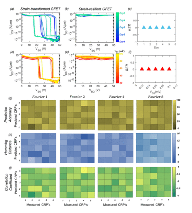 圖5. SPUF可靠性。代表性的(a)轉(zhuǎn)化應(yīng)變和(b)應(yīng)變彈性GFET的轉(zhuǎn)移特性作為天數(shù)的函數(shù)。(c) 作為天數(shù)的函數(shù)的相應(yīng)誤碼率(BER)。CRP中的16個(gè)比特中沒(méi)有一個(gè)被翻轉(zhuǎn),導(dǎo)致BER=0,并確認(rèn)SPUF隨著時(shí)間的推移是穩(wěn)定的。代表性的(d)應(yīng)變轉(zhuǎn)換的GFET和(e)使用范圍從20到100 mV的不同VDS測(cè)量的應(yīng)變彈性GFET的傳遞特性。(f)作為VDS的函數(shù)的對(duì)應(yīng)BER。BER=0,確認(rèn)SPUF對(duì)電源電壓變化的彈性。實(shí)驗(yàn)測(cè)量的CRP和從基于NF=1、2、4和8階傅立葉級(jí)數(shù)的回歸分析獲得的預(yù)測(cè)的CRP之間的(g)預(yù)測(cè)精度、(h)HD和(i)CC的色圖。