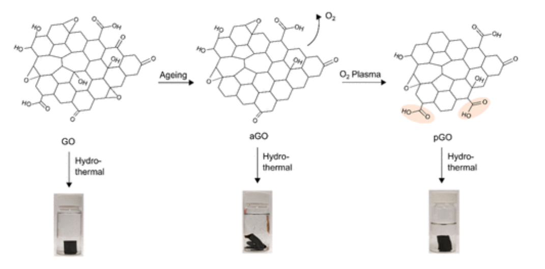 從氧化石墨烯前體生產(chǎn)高度穩(wěn)定、無(wú)缺陷和導(dǎo)電的3D石墨烯結(jié)構(gòu)具有挑戰(zhàn)性。這是因?yàn)檠趸┦且环N亞穩(wěn)態(tài)材料,其結(jié)構(gòu)和化學(xué)性質(zhì)因老化而演變。老化改變了附著在氧化石墨烯上的氧官能團(tuán)的相對(duì)組成,并對(duì)還原氧化石墨烯的制造和性能產(chǎn)生負(fù)面影響。在這里,我們報(bào)道了一種使用氧等離子體處理逆轉(zhuǎn)氧化石墨烯前體老化的通用策略。這種處理降低了氧化石墨烯薄片的尺寸,并恢復(fù)了負(fù)ζ電位和水中懸浮液的穩(wěn)定性,從而能夠使用水熱合成制備緊湊且機(jī)械穩(wěn)定的石墨烯氣凝膠。此外,我們采用高溫退火來(lái)去除還原氧化石墨烯中的含氧官能團(tuán)并修復(fù)晶格缺陷。該方法允許獲得具有390S/m的電導(dǎo)率和低缺陷密度的高導(dǎo)電石墨烯氣凝膠。使用X射線光電子和拉曼光譜對(duì)羧基、羥基、環(huán)氧化物和酮氧物種的作用進(jìn)行了徹底的研究。我們的研究為氧化石墨烯從室溫到2700°C的老化和熱還原過(guò)程中發(fā)生的化學(xué)轉(zhuǎn)變提供了獨(dú)特的見(jiàn)解。