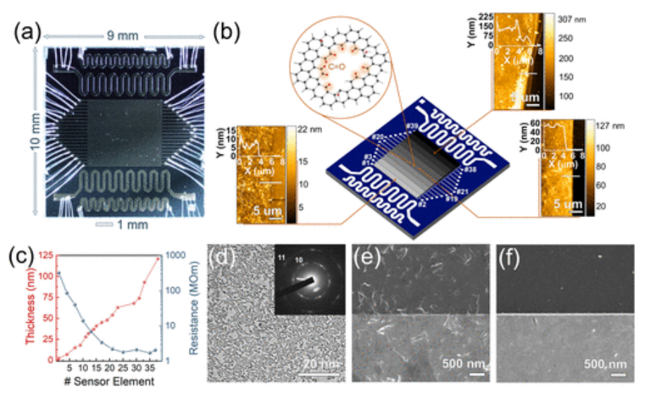 圖2:基于C-ny石墨烯的片上多傳感器陣列的表征。(a) C-ny石墨烯層厚度逐漸變化的芯片的光學(xué)圖像和(b)示意圖模型。插入─芯片的三個(gè)不同區(qū)域中不同厚度的C-ny石墨烯層的AFM圖像和高度分布;(c) 芯片上的c-ny石墨烯層的厚度和電阻;(d) 單個(gè)C-ny石墨烯層的TEM圖像和相應(yīng)的ED圖案,表示其穿孔結(jié)構(gòu);(e,f)C-ny石墨烯層的薄(e)和厚(f)區(qū)域或厚度分別為4–7和117–153 nm的SEM圖像。
