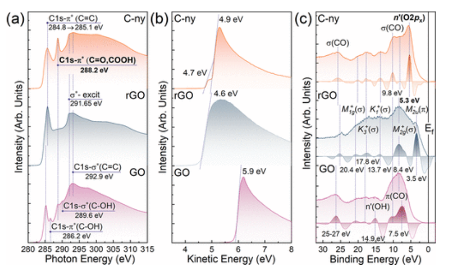圖4.C-ny石墨烯、原始rGO和初始GO的電子結(jié)構(gòu)。(a) 所研究材料的C K邊X射線吸收光譜、(b)截止SE光譜、(C)VB光譜及其二階導(dǎo)數(shù)(−d