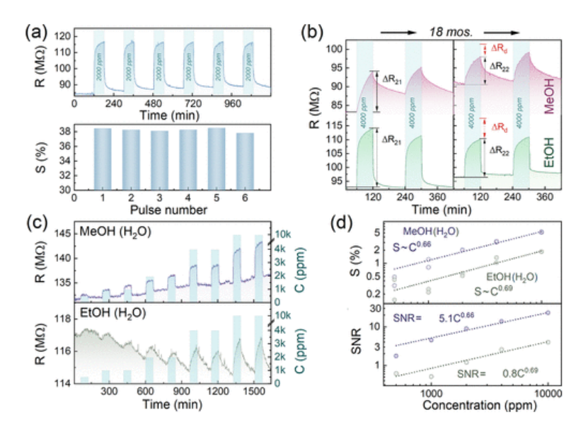 圖6.基于石墨烯衍生物的片上多傳感器陣列的氣敏性能。(a) 由C-ny石墨烯組成的示例性傳感器在暴露于2000ppm濃度的水蒸氣的六個(gè)連續(xù)脈沖時(shí)的R(t)趨勢(shì)(上線)和相應(yīng)的化學(xué)電阻響應(yīng)(底線)。(b) 由暴露于4000ppm甲醇和乙醇的C-ny石墨烯組成的示例性傳感器的電阻瞬變間隔18個(gè)月獲得。(c) 示例性傳感器元件朝向潮濕空氣中的甲醇和乙醇的R(t)趨勢(shì)。(d) 示例性傳感器元件的化學(xué)電阻響應(yīng)和SNR幅度相對(duì)于潮濕空氣中甲醇和乙醇的濃度。