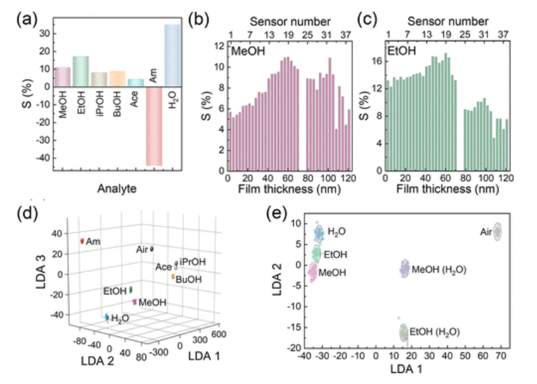 圖7.檢測(cè)分析物VOCs的識(shí)別結(jié)果,濃度為4000ppm。(a) 多傳感器陣列對(duì)干燥空氣和水蒸氣中的醇、氨、丙酮的中值化學(xué)電阻響應(yīng)。(b,c)基于芯片c-ny-的多傳感器陣列上的傳感器元件對(duì)干燥空氣中的(d)甲醇和(e)乙醇的化學(xué)電阻響應(yīng)的變化。由于在多個(gè)芯片測(cè)量中發(fā)現(xiàn)的不一致性,60–80 nm范圍內(nèi)的數(shù)據(jù)被排除在外。(a) 用于在干燥空氣中為整套分析物記錄的數(shù)據(jù)的7D LDA總空間的主要3-D橫截面;(b) C-ny石墨烯在干燥和潮濕空氣中對(duì)甲醇和乙醇的多傳感器信號(hào)的5D LDA總空間的初級(jí)LDA分量的2D投影;點(diǎn)是通過LDA聚類的實(shí)驗(yàn)矢量信號(hào)數(shù)據(jù),分類球是在0.7置信水平的類內(nèi)數(shù)據(jù)的高斯分布下構(gòu)建的,以框定與分析物相關(guān)的空間區(qū)域。