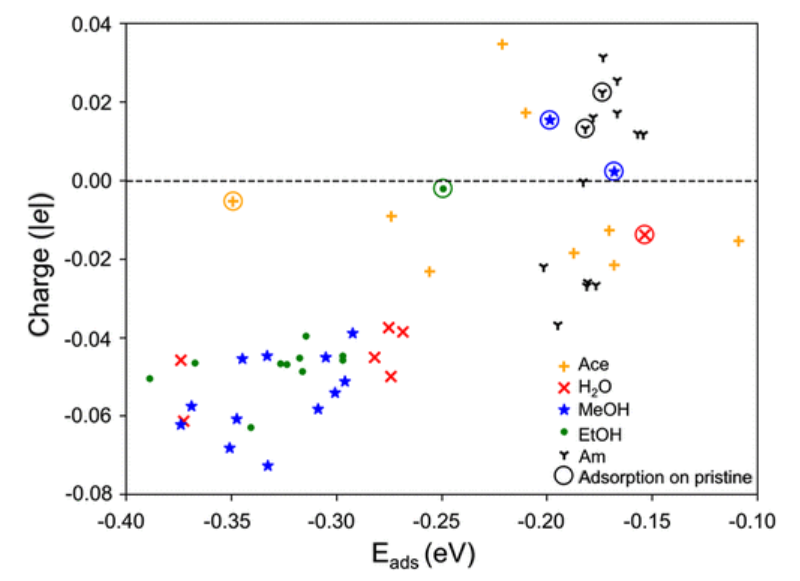 圖9.DFT建模的結(jié)果顯示了處于吸附狀態(tài)的分析物分子上的電荷與相應(yīng)的吸附能的關(guān)系。帶圓圈的標(biāo)記表示在原始石墨烯表面上的吸附。