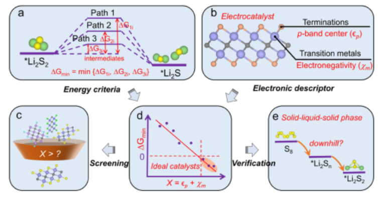 MXenes,二維過渡(2D)金屬碳化物/氮化物,由于其氧化還原活性位點的多樣性和快速的電子轉(zhuǎn)移,已顯示出作為陰極催化劑的前景,以加速鋰-硫(Li - S)電池中多硫鋰(LiPSs)的轉(zhuǎn)化。然而,從成千上萬的MXenes中有效地篩選出最優(yōu)的陰極催化劑是具有挑戰(zhàn)性的。為了解決這一問題,本論文開發(fā)了一個模型,可以準(zhǔn)確預(yù)測Li - S電池中限速步驟的熱力學(xué)能量勢壘。MXene位點的局部化學(xué)反應(yīng)性與末端的p帶中心和亞表面過渡金屬的電負(fù)性聯(lián)系起來。通過密度泛函理論計算和純MXenes與摻雜zn MXenes的對比實驗,定性驗證了模型的準(zhǔn)確性。利用該模型,我們篩選了大量的MXenes庫(27種五原子層MXenes),并確定了Ti
