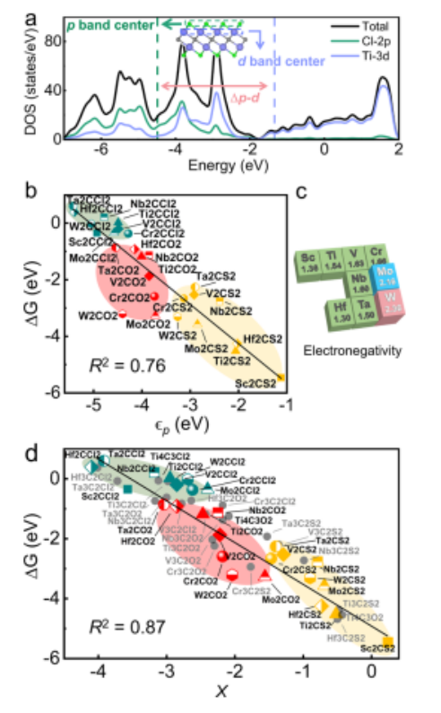 圖3. ΔG與不同MXenes的(a) p帶中心和(b) Δ(p−d)的關(guān)系。(c) Li