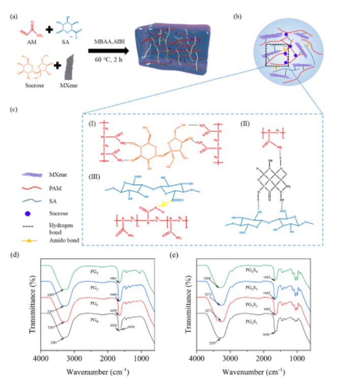 圖1. (a)制備PGMS水凝膠的示意圖。(b)水凝膠內(nèi)部結(jié)構(gòu)示意圖。(c)水凝膠網(wǎng)絡(luò)中的分子相互作用示意圖。(d)不同SA含量水凝膠的FTIR光譜。(e)不同蔗糖含量水凝膠的FTIR光譜。
