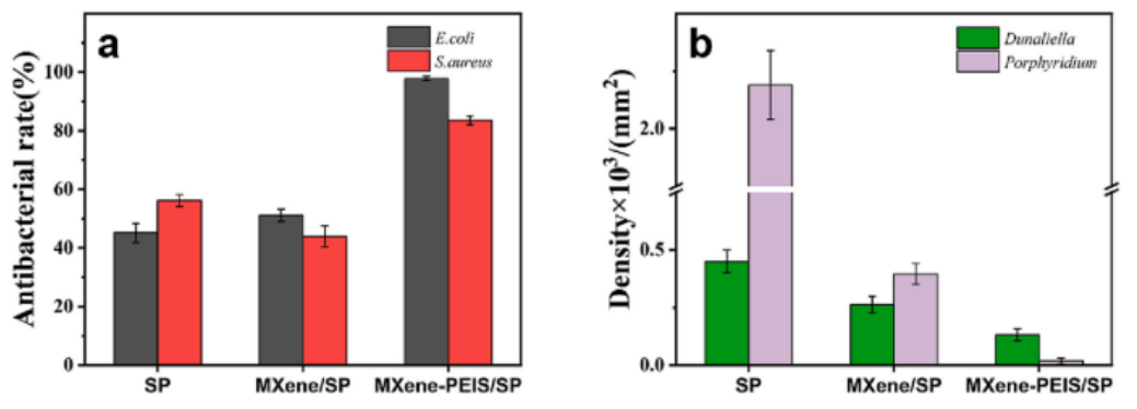 海洋生物污染是一個(gè)全球性的問(wèn)題,給海洋工程帶來(lái)了重大挑戰(zhàn)。MXene納米片和兩性離子聚合物是一種很有前景的海洋抗生物污染材料,備受關(guān)注。本文中,我們?cè)贛Xene納米片表面自組裝聚多巴胺層(MXene-PDA),然后通過(guò)邁克爾加成反應(yīng)將兩性離子聚合物(PEIS)引入PDA層,得到兩性離子聚合物功能化的MXene納米片(MXene-PEIS)。通過(guò)MXene納米片與兩性離子聚合物PEIS的協(xié)同抗污作用,MXene-PEIS表現(xiàn)出了優(yōu)異的抗污性能(抗菌率提高了88%,微藻黏附密度降低了98%)。此外,將制備好的MXene-PEIS納米片與自?huà)伖馔繉庸不?,得到了納米復(fù)合防污涂層(MXene-PEIS/ SP)。結(jié)果表明,MXene-PEIS/SP涂層具有良好的防污性能,這是由于MXene、PEIS和自?huà)伖馔繉又g的協(xié)同作用。