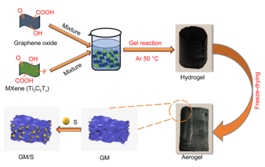 x) (GM)氣凝膠,并將其應用于鋰硫電池。該策略將二維(2D) GO片和高導電性MXene納米片集成在一起,形成三維多孔氣凝膠結(jié)構(gòu),形成三維導電網(wǎng)絡(luò)和大極性表面,可同時實現(xiàn)快速的鋰離子/電子傳遞、強化學錨定硫以及促進多硫化物之間的氧化還原反應。因此,陰極顯示出良好的硫利用率和循環(huán)穩(wěn)定性。制備的GM電極電池已在0.1C下進行了近9個月的測試,提供了1255.62 mAhg