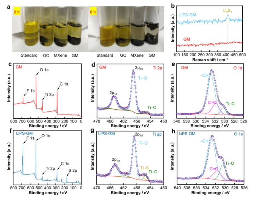 4的可視化吸附試驗;b GM復合材料和LiPS-GM復合材料的拉曼光譜;GM復合材料的XPS分析及其在d Ti 2p和e O 1s核心層的高分辨率光譜XPS分析LiPS-GM復合材料及其在g Ti 2p和h O 1s、的高分辨率光譜。