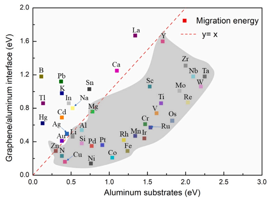 圖5. 合金原子在鋁基體和石墨烯/鋁界面上遷移能的比較。