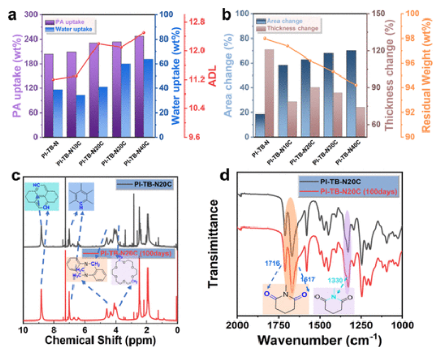 2O 吸附容量和 ADL。(b) 尺寸穩(wěn)定性和氧化穩(wěn)定性。(c,d)在 PA 中浸泡 100 天前后的FT-IR 和 H