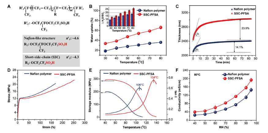 Fig 3. ( A ) PFSA 離聚物的化學(xué)結(jié)構(gòu)。( B ) PFSA 膜的吸水率和相應(yīng)的含水量(插圖)。( C ) PFSA 膜在室溫和飽和水蒸氣環(huán)境下厚度方向的溶脹率 (~2 μm)。( D ) 膜在 23±2℃和 50% RH 下的應(yīng)力-應(yīng)變曲線。( E ) PFSA 膜的動(dòng)態(tài)力學(xué)分析光譜。( F ) PFSA 膜在 80℃和不同 RH 值下的質(zhì)子傳導(dǎo)率。