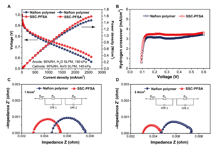 2 /空氣下的極化曲線。( B ) 在 80℃和 95% RH 且無(wú)背壓的情況下,具有膜 LSV 的 MEA 中的氫交叉電流。EIS 測(cè)量:在 ( C ) 1 A/cm