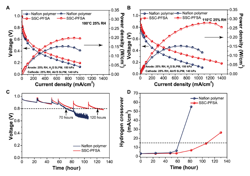 2/空氣下的極化曲線。( C ) 在 90℃和 30% RH 下的 OCV 測(cè)試和 ( D ) 在 75℃和 100% RH 下的氫交叉。SLPM,標(biāo)準(zhǔn)升每分鐘。