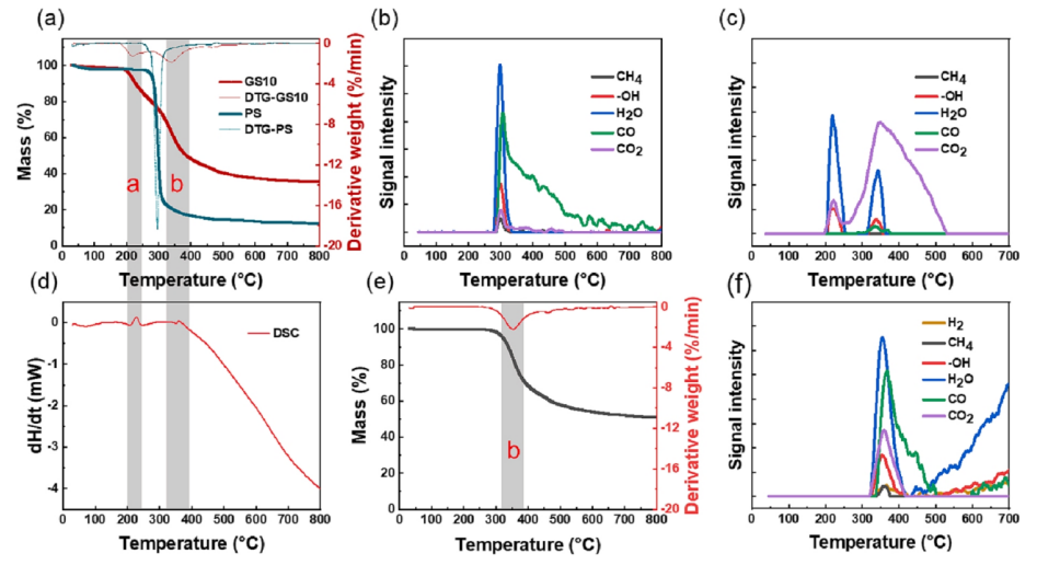 圖3. PS和GS10的TG-DTG曲線(a),PS(b)和GS10(c)的MS光譜,GS10(d)的DSC曲線,GS10-280(e)的TG-DTG-曲線,以及GS10-280的MS光譜(f)。