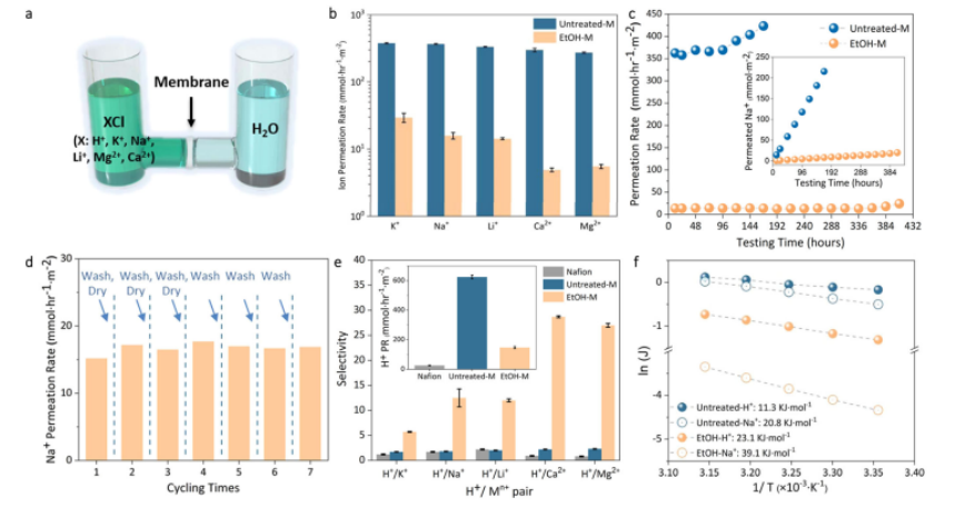 x通道可以建立多個氫鍵,其小于1納米的尺寸通過保持溶劑-MXene距離和溶劑取向來誘導(dǎo)納米約束效應(yīng),從而大大加強了這些相互作用。在亞1-nm離子篩選和分離中,修飾后的膜表現(xiàn)出穩(wěn)定的離子排斥和質(zhì)子化(H+/Mn+)選擇性,分別比原始膜高50倍和30倍。它證明了非共價方法作為一種廣泛的修飾替代方法在能源、資源和環(huán)境相關(guān)應(yīng)用中的納米通道的可行性。