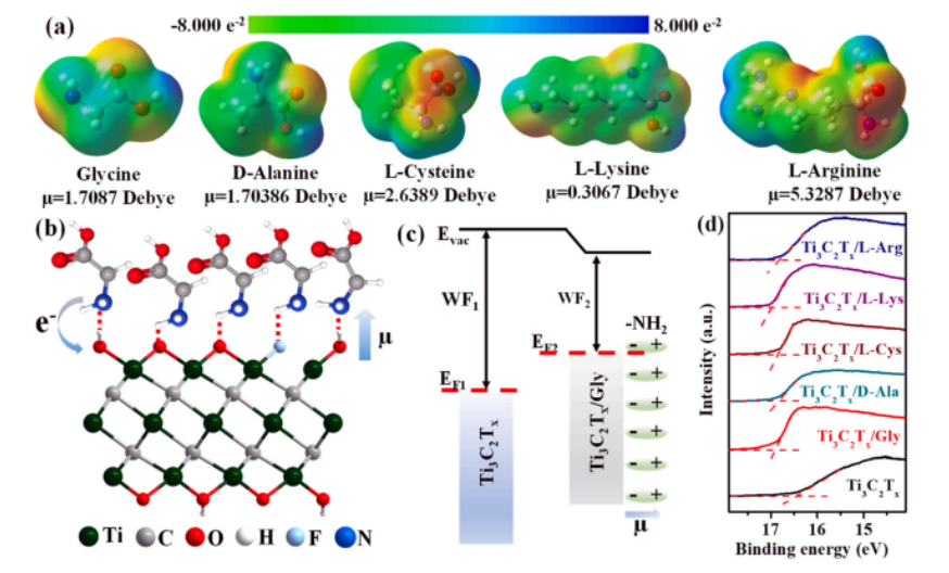 圖4. (a)甘氨酸、d -丙氨酸、l -半胱氨酸、l -賴氨酸和l -精氨酸的分子結(jié)構(gòu)和映射到總電子表面的ESP。(b) Glycine和Ti