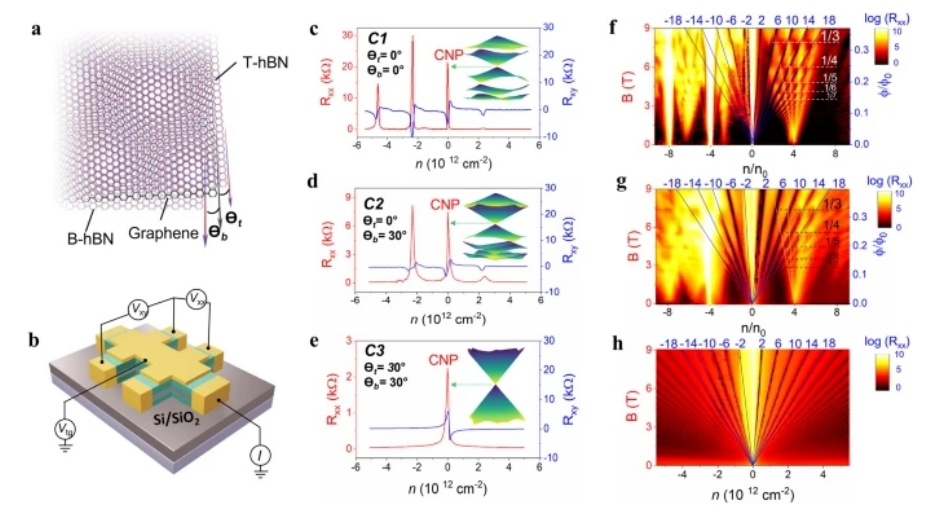 θb)的超云紋晶格的藝術(shù)視圖。 b 具有雙莫爾條紋的頂柵裝置的示意圖。 B = 0.5 T 時(shí)的縱向電阻(左軸)和霍爾電阻(右軸)與 (c)、C1 (0°/0°)、(d)、C2 (0°/30°) 和 (e)、C3 (30°/30°) 的載流子密度。插圖顯示了 K 點(diǎn)處相應(yīng)的能帶結(jié)構(gòu)。 CNP是指狄拉克能帶的電荷中性點(diǎn)。(f)、C1、(g)、C2 和 (h)、C3 在磁場(chǎng)中繪制的朗道扇形圖(左)以及相應(yīng)的