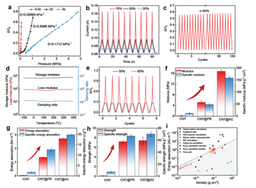 0; d)-100至400℃溫度范圍內(nèi)的動(dòng)態(tài)壓縮性能; e) 超低溫(液氮中)30%、60%時(shí)的電流信號(hào); f–h) CNT@AC-3s與CNT、CNT@PR在80%應(yīng)變下三個(gè)關(guān)鍵能量吸收性能的比較; i) 50%時(shí)CNT@AC的能量吸收能力與之前報(bào)道的吸收材料的比較。考慮到CNT@AC的能量吸收能力高于大多數(shù)氣凝膠材料,因此選擇了一些典型的晶格材料進(jìn)行比較。