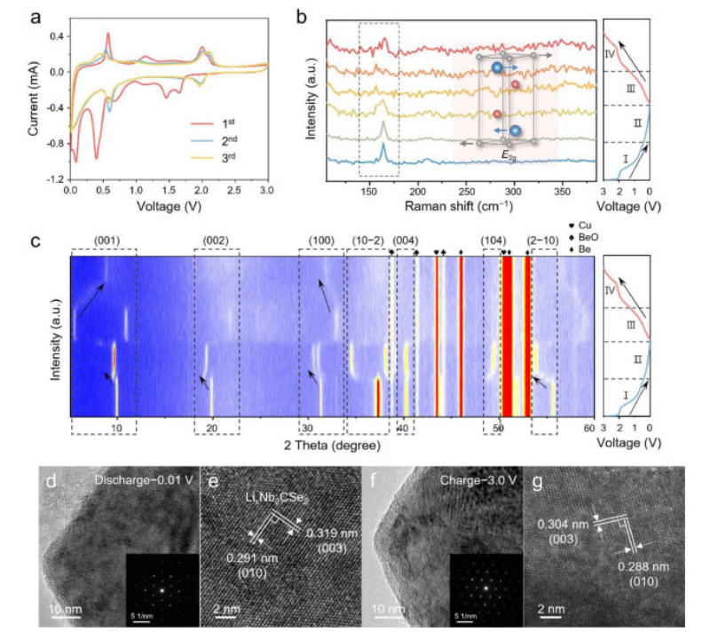 Fig 5. (a) Nb2CSe2 前三個(gè)循環(huán)的 CV 曲線。第一循環(huán)中 Nb2CSe2 的原位 (b) 拉曼光譜和 (c) XRD 圖案。最終放電狀態(tài)下 Nb2CSe2 的異位 (d, e) HRTEM 圖像和 SEAD 圖案(插圖)。最終充電狀態(tài)下 Nb2CSe2 的異位 (f, g) HRTEM 圖像和 SEAD 圖案(插圖)。