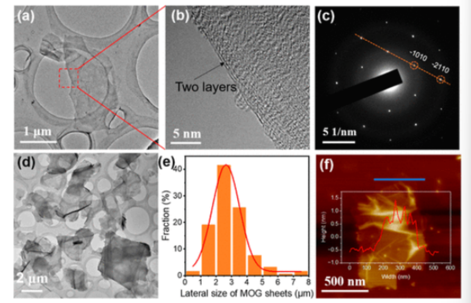 圖2:剝離MOG片材的形態(tài)和結(jié)構(gòu)。(a) 剝離的MOG片材的TEM圖像。(b) HRTEM圖像顯示了剝離的MOG片材的兩層結(jié)構(gòu)的邊緣。(c) (b)中對應(yīng)的SAED圖像。(d) 分散良好的剝離MOG片材的TEM圖像。(e) 根據(jù)200張計算的MOG片材的橫向尺寸分布。(f) 幾層MOG片的AFM圖像。