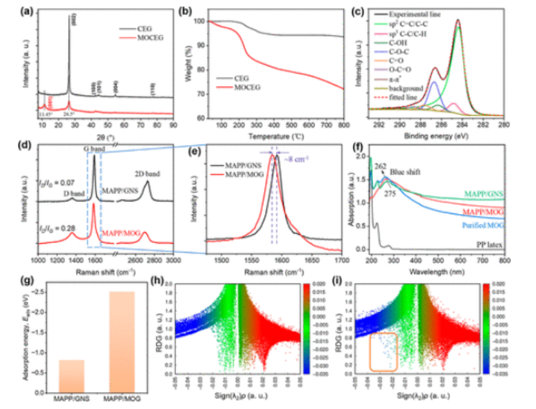 圖3.CEG的界面工程以及MOG和MAPP之間的非共價相互作用。(a) CEG和MOCEG的XRD圖譜和(b)TGA曲線。(c) MOCEG的XPS C1s峰和組分?jǐn)M合。(d) 拉曼光譜和(e)GNS和MOG的G帶的相應(yīng)放大圖。(f) MAPP膠乳(黑色)、MAPP/GNS分散體(綠色)和MAPP/MOG分散體在離心前(紅色)和離心后(藍色)的紫外-可見吸收光譜。(g) MAPP分子在GNS和MOG片上的吸附能。MAPP與(h)GNS和(i)MOG的RDG散點圖,橙色矩形顯示MOG和MAPP之間的強氫鍵相互作用。