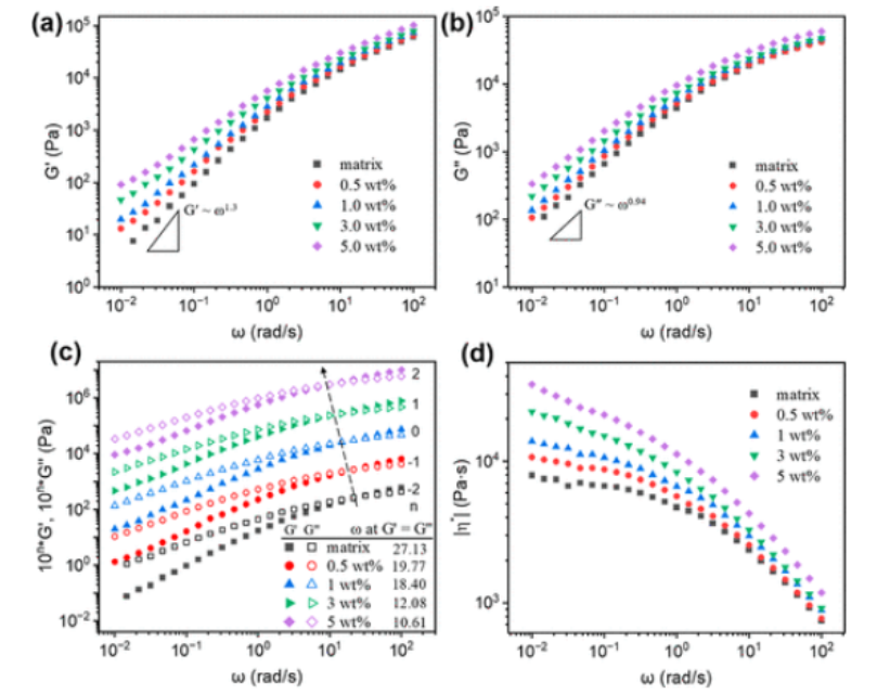 圖5.PP-M/MOG納米復(fù)合材料的流變性能。(a) 儲能模量(G′)。(b) 損耗模量(G〃)。(c) G′和G〃沿Y軸分別乘以10n。(d) 具有不同MOG含量的PP-M/MOG納米復(fù)合材料在180°C下的復(fù)粘度(η*)與角頻率(ω)。
