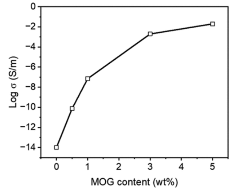 圖8.PP-M基體和PP-M/MOG納米復(fù)合材料的電導(dǎo)率。
