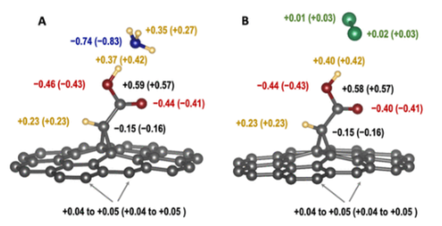 圖5.計(jì)算了g7×7/1a與氨(A)和氯(B)相互作用之前和之后的部分電荷。為了清晰起見,石墨烯的原子被去除了。
