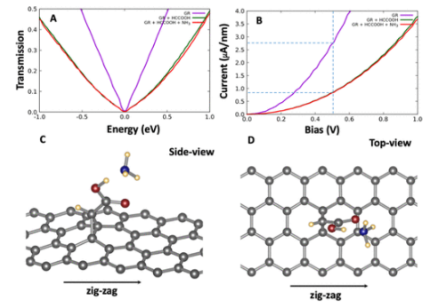 圖6.面板(A)具有(紅色)和不具有(綠色)氨的裸露石墨烯(紫色)和g7×7/1a納米片在不同能量下的電子傳輸圖。面板(B)在不同電位偏壓下,裸石墨烯(紫色)和具有(紅色)和不具有(綠色)氨的g7×7/1a納米片的模擬電流密度。面板(C,D)包含與氨分子相互作用的功能化石墨烯層的球和棒表示的不同視圖。