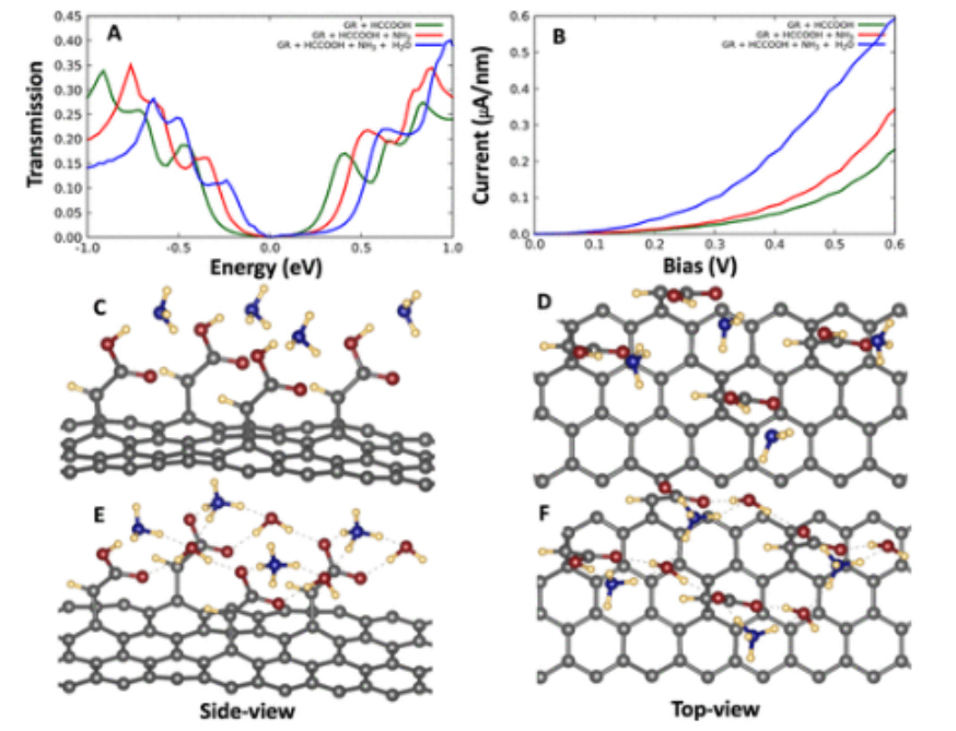 圖7.面板(A)在氨(紅色)存在下和每個(gè)羧酸官能團(tuán)添加一個(gè)水分子(藍(lán)色)后,裸露(綠色)g7×7/1a納米片在不同能量下的電子透射圖。面板(B)模擬了在存在氨(紅色)和添加水(藍(lán)色)后,裸露(綠色)g7×7/1a納米片在不同電位偏壓下的電流密度。面板(C,D)包含與氨分子相互作用的功能化石墨烯層的球和棒表示的不同視圖。面板(E,F(xiàn))包含添加水分子后與氨分子相互作用的功能化石墨烯層的球和棒表示的不同視圖。虛線表示由羧酸根離子、銨離子和水分子在改性石墨烯表面上建立的氫鍵網(wǎng)絡(luò)。