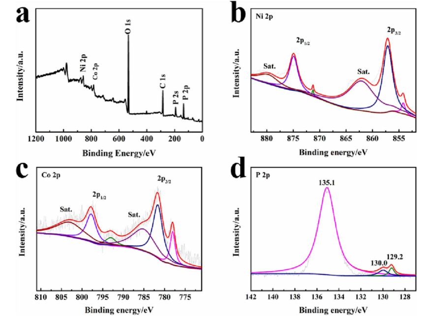 圖2. NiCoP-NF@rGO材料的XPS譜(a)全XPS譜,(b) Ni 2p, (c) Co 2p, (d) P 2p。