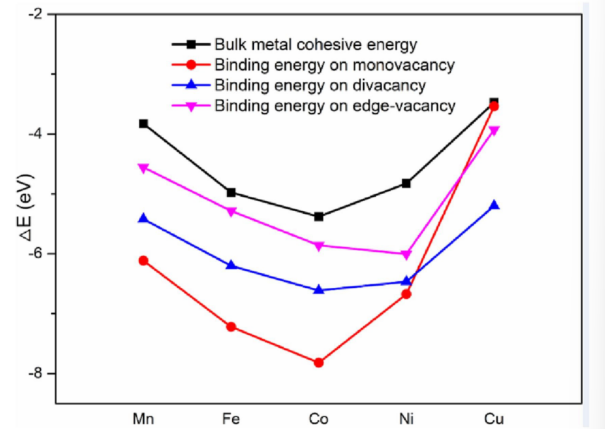 圖2. 缺陷石墨烯上負(fù)載的單個(gè)金屬原子的結(jié)合能和塊狀金屬的相應(yīng)內(nèi)聚能。