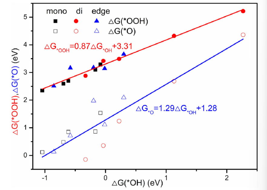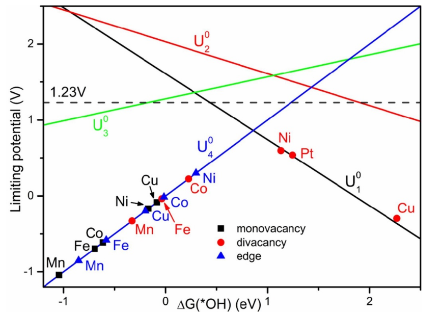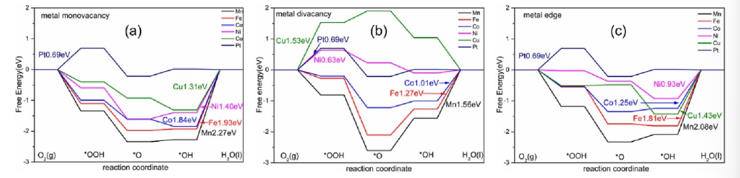 近年來,制備出了摻雜在石墨烯空位缺陷上的單Pt原子,并表現(xiàn)出優(yōu)異的氧還原反應(yīng)活性和耐久性。在這里,我們選擇它作為基準(zhǔn)來尋找類似甚至更好的催化劑,進(jìn)行密度泛函計(jì)算來探索五種單一的三維過渡金屬(Mn, Fe, Co, Ni, Cu)摻雜在缺陷石墨烯上用于ORR的可能性。研究了相應(yīng)的穩(wěn)定性和ORR活度。結(jié)果表明,純?nèi)毕菔┛梢宰鳛橐r底穩(wěn)定所選的5種單一過渡金屬。反應(yīng)中間體的吸附自由能相互標(biāo)度,并以此為基礎(chǔ)得到活火山圖。在所有結(jié)構(gòu)中,摻雜在空位石墨烯上的Ni原子表現(xiàn)出最低的理論過電位,甚至優(yōu)于實(shí)驗(yàn)中摻雜在空位石墨烯上的Pt單原子。