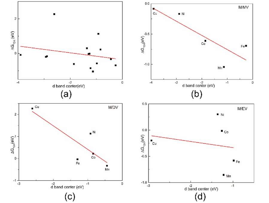 圖6. (a) 15個(gè)缺陷石墨烯支撐的過渡金屬原子d能帶中心與*OH吸附自由能的關(guān)系(b)過渡金屬摻雜單空位石墨烯,(c)過渡金屬摻雜雙空位石墨烯,(d)過渡金屬摻雜石墨烯邊緣空位。