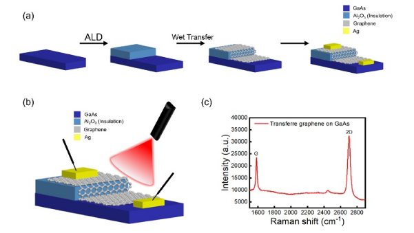 圖1. (a)石墨烯/GaAs光電探測(cè)器的制作流程圖。(b)石墨烯/GaAs光電探測(cè)器測(cè)試圖。(c)石墨烯在GaAs上轉(zhuǎn)移的拉曼光譜。