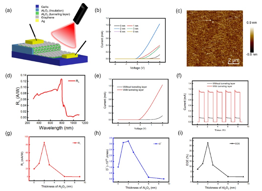 3 (2nm)/GaAs與石墨烯/GaAs的光電流和(f) I-T對(duì)比圖。(g-i)不同Al
