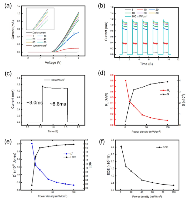 2)下635 nm光照下石墨烯/GaAs光電探測(cè)器的I-V和(b) I-T特性。(c)放大和歸一化脈沖響應(yīng),以評(píng)估光電探測(cè)器的上升和衰減時(shí)間估計(jì)。(d-f) 2V下石墨烯/GaAs光電探測(cè)器的光功率依賴性R