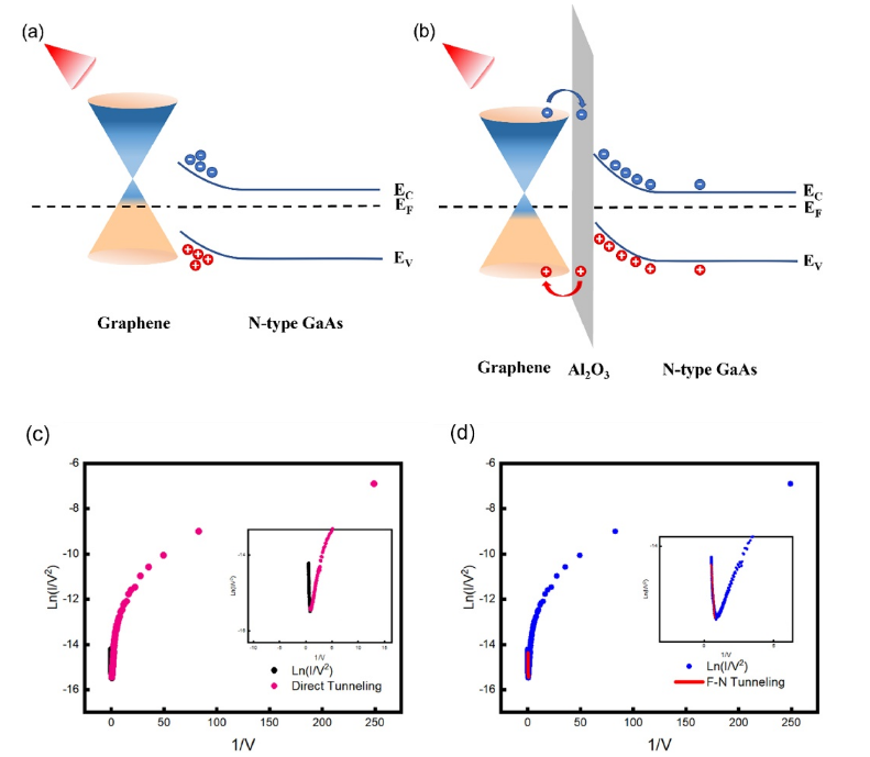 圖5. (a)石墨烯和n-型GaAs在一定電壓偏壓下的能級(jí)示意圖。(b)在一定電壓偏置下,石墨烯與n-型GaAs之間插入Al