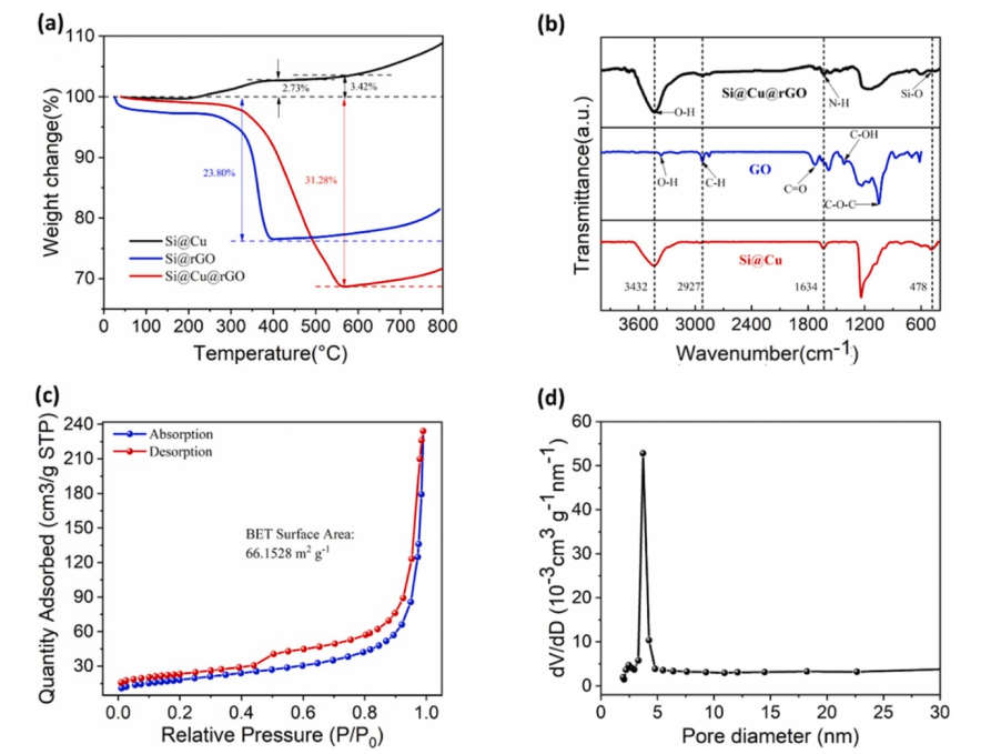 圖5. (a) TGA曲線;(b)制備的復合材料的FT-IR圖;(c) Si@Cu@rGO復合材料的N
