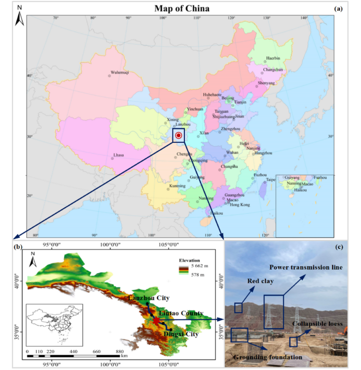 圖1. 定西-蘭臨輸電線路臨洮段位置及遠景:(a)中國地圖,(b)甘肅省地形圖,(c)野外圖。