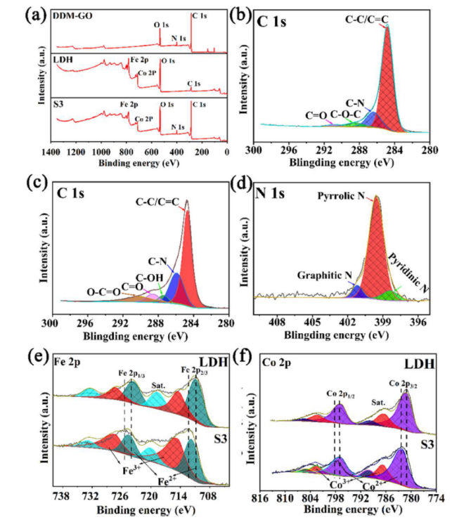 圖4. (a)DDM-GO、LDH和S3的寬XPS譜,(b)DDM-GO的C 1s譜,(c)S3的C 1s譜,(d)DDM-GO的N 1s譜,LDH和S3的Fe 2p (e)和Co 2p (f)譜。