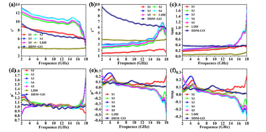 圖7. S1、S2、S3、S4、S5、LDH和DDM-GO的電磁參數(shù)。