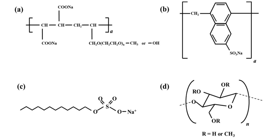圖2. 用于分離和穩(wěn)定水溶液中石墨烯的有機添加劑的化學(xué)結(jié)構(gòu):(a)聚羧酸醚高效減水劑;(b)萘磺酸甲醛高效減水劑;(c)十二烷基硫酸鈉和(d)甲基纖維素。