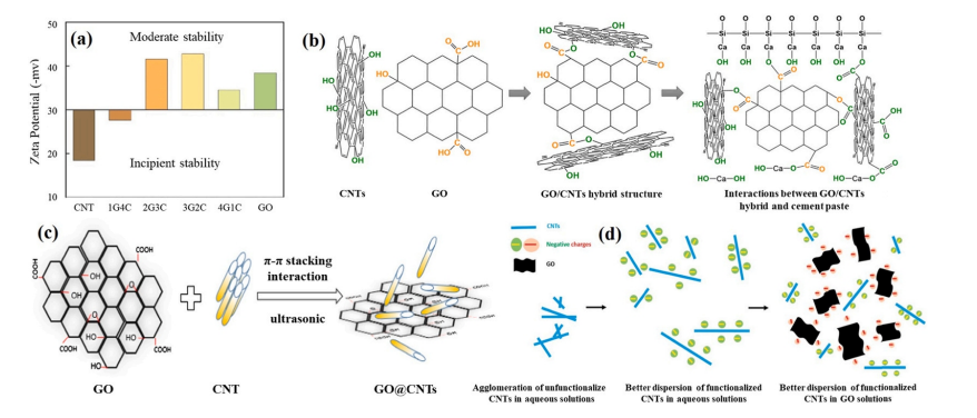 圖19. 混合氧化石墨烯/碳納米管的色散效率:(a)不同比例氧化石墨烯:碳納米管樣品的Zeta電位,(b-d)混合氧化石墨烯/碳納米管的擴散機制示意圖。