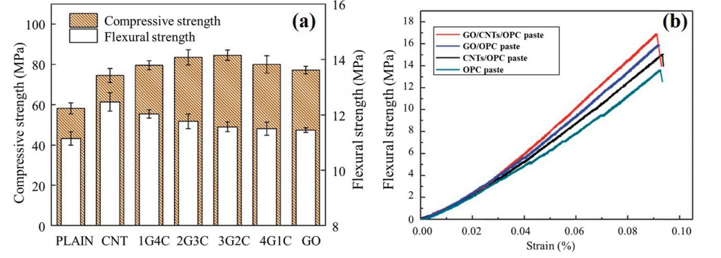 圖20. 不同比例的氧化石墨烯/碳納米管增強水泥漿體的機械強度:(a) Du等人和(b) Lu等人。